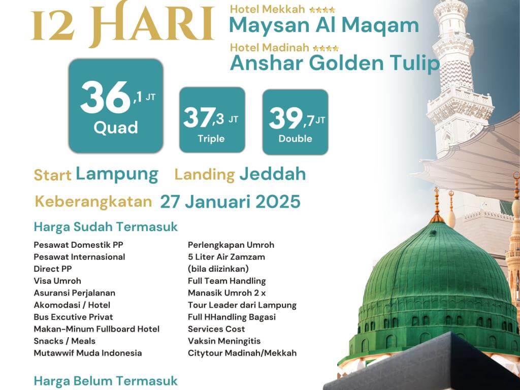 - Pendaftaran disertai dengan Deposit minimum IDR 5.000.000, dengan pelunasan biaya paket maksimal 3 (tiga) minggu sebelum Jadwal Keberangkatan